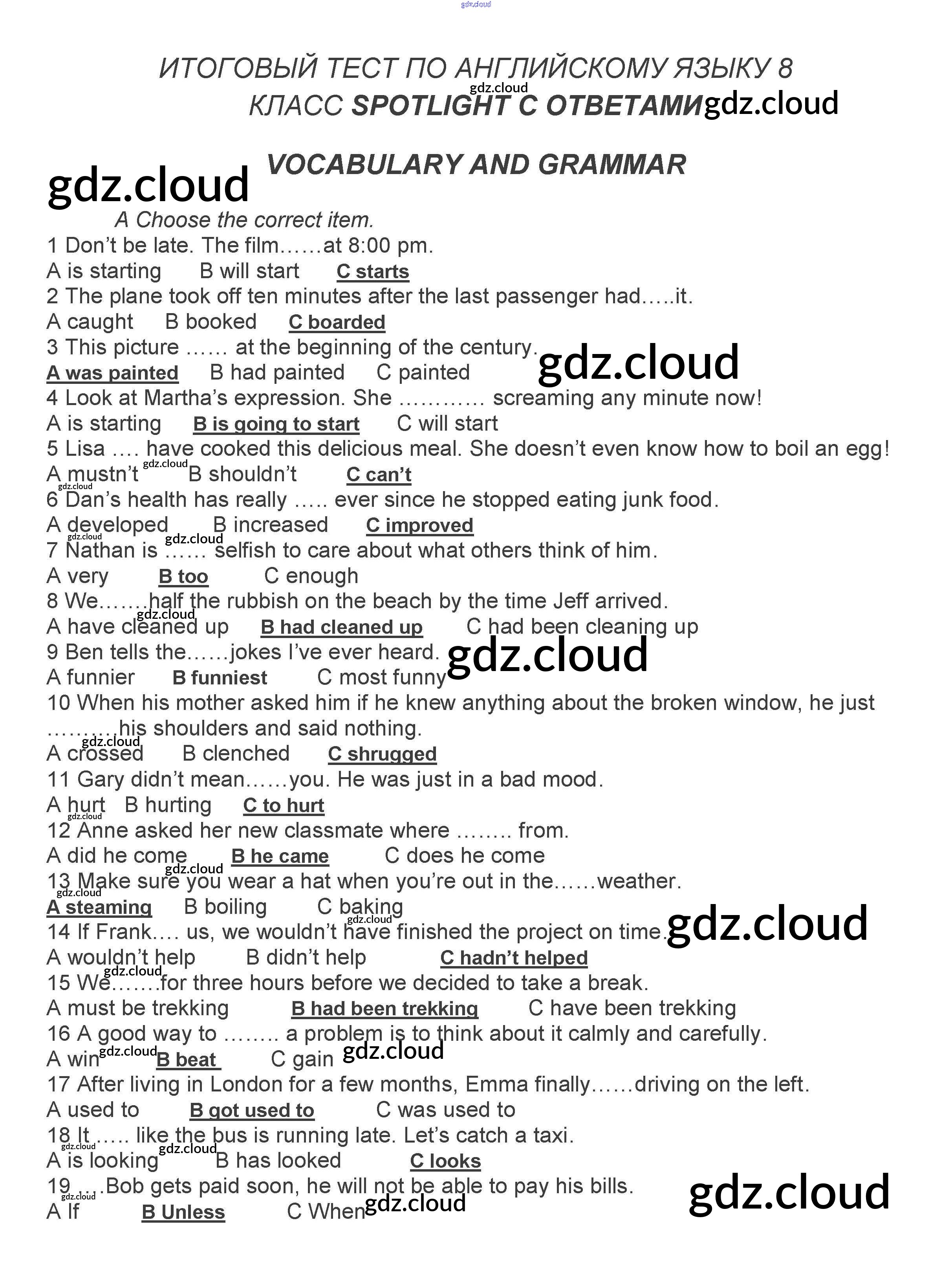 Ответы. Итоговый тест  по Английскому языку 8 класс Контрольные задания Ваулина Spotlight   Просвещение