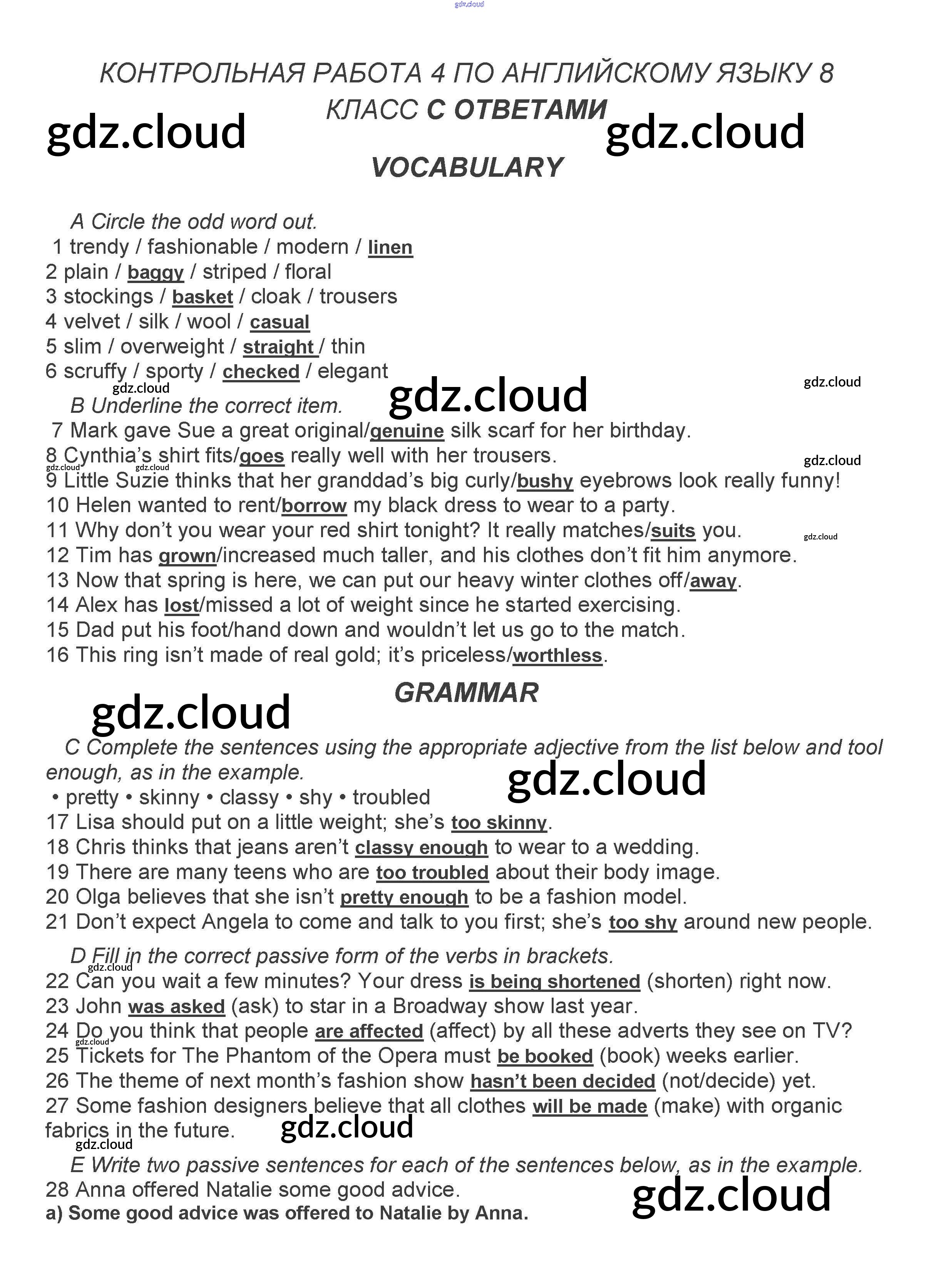Ответы. Контрольная работа 4  по Английскому языку 8 класс Контрольные задания Ваулина Spotlight   Просвещение