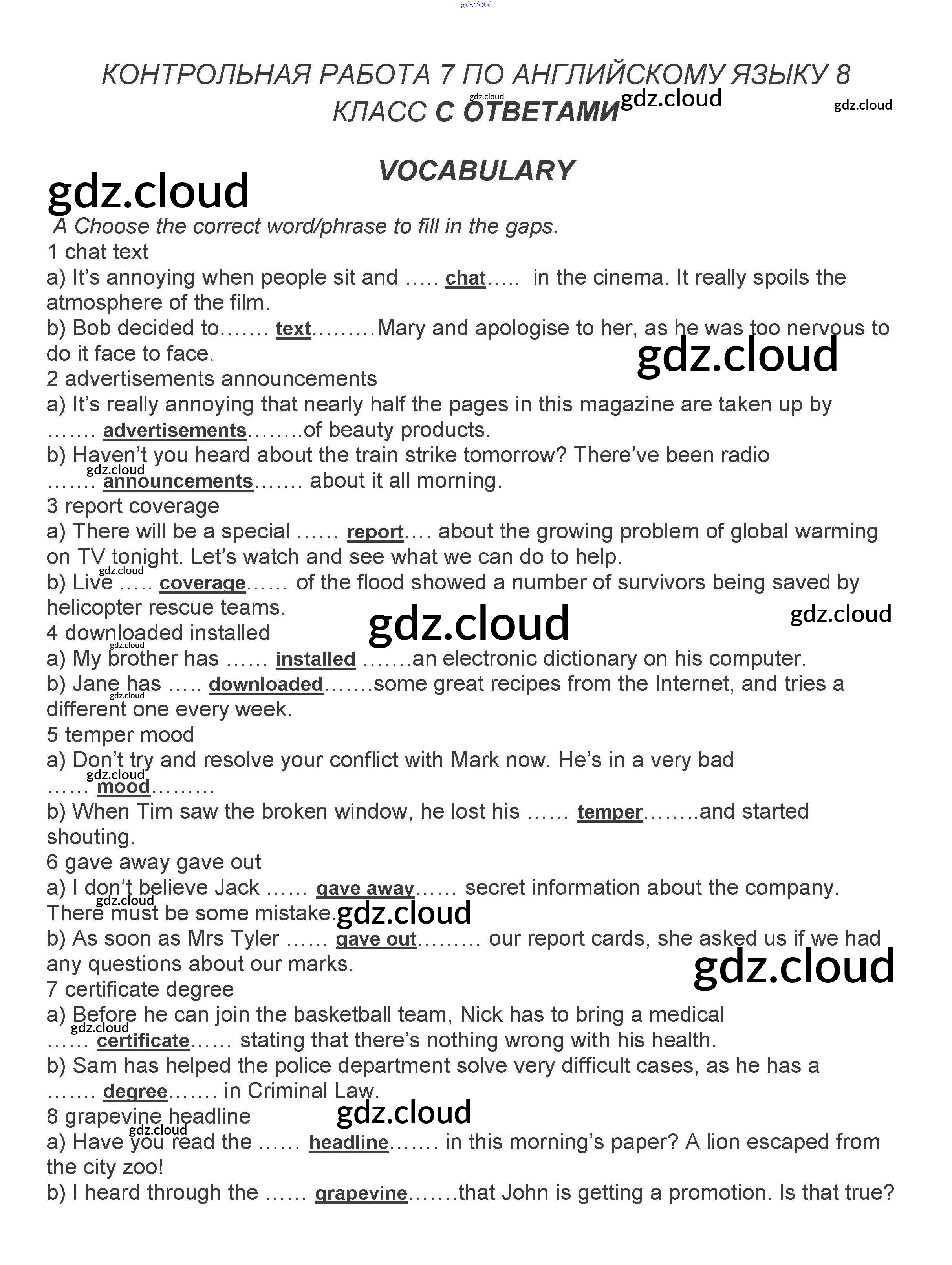 Ответы. Контрольная работа 7  по Английскому языку 8 класс Контрольные задания Ваулина Spotlight   Просвещение