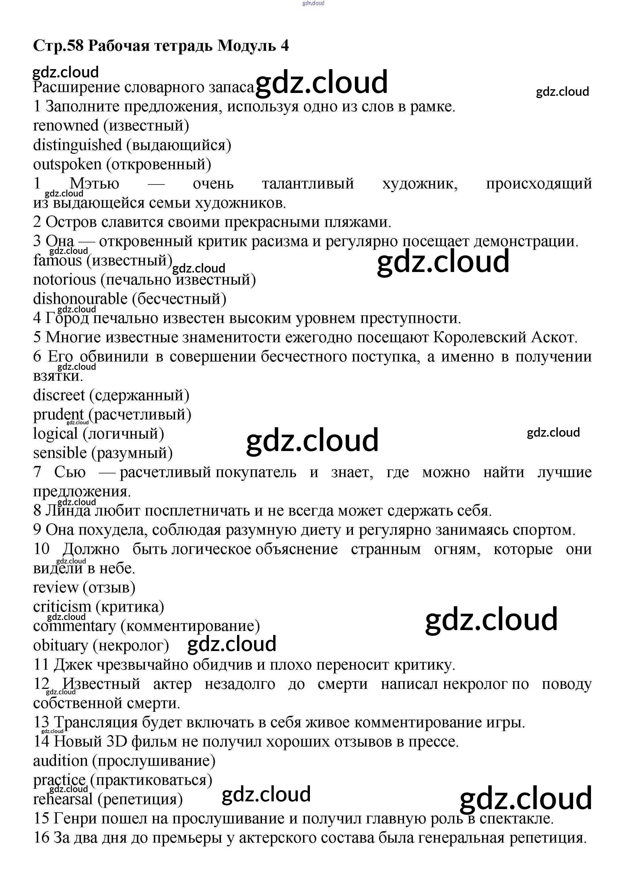 Ответ на задание стр.58 Рабочая тетрадь Английский язык за 9 (девятый) класс Баранова, Дули, Эванс, Копылова, Мильруд Starlight Углубленный уровень 2017