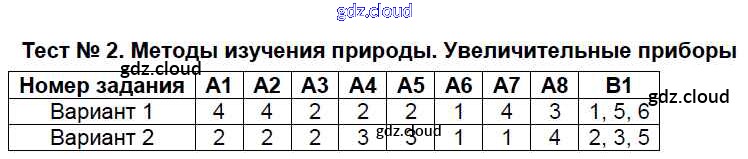Ответ на задание Тест №2. Методы изучения природы. Увеличительные приборы Контрольно-измерительные материалы (КИМ) Биология за 5 (пятый) класс Богданов 2017
