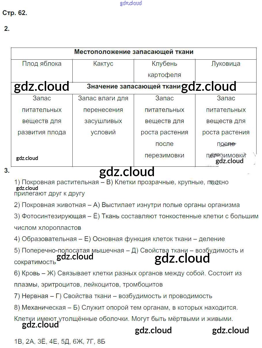 Ответ на задание стр.62 Тетрадь-тренажер Биология за 5, 6 (пятый, шестой) класс Сухорукова, Кучменко, Дмитриева Сферы 2016 Часть 1, 2