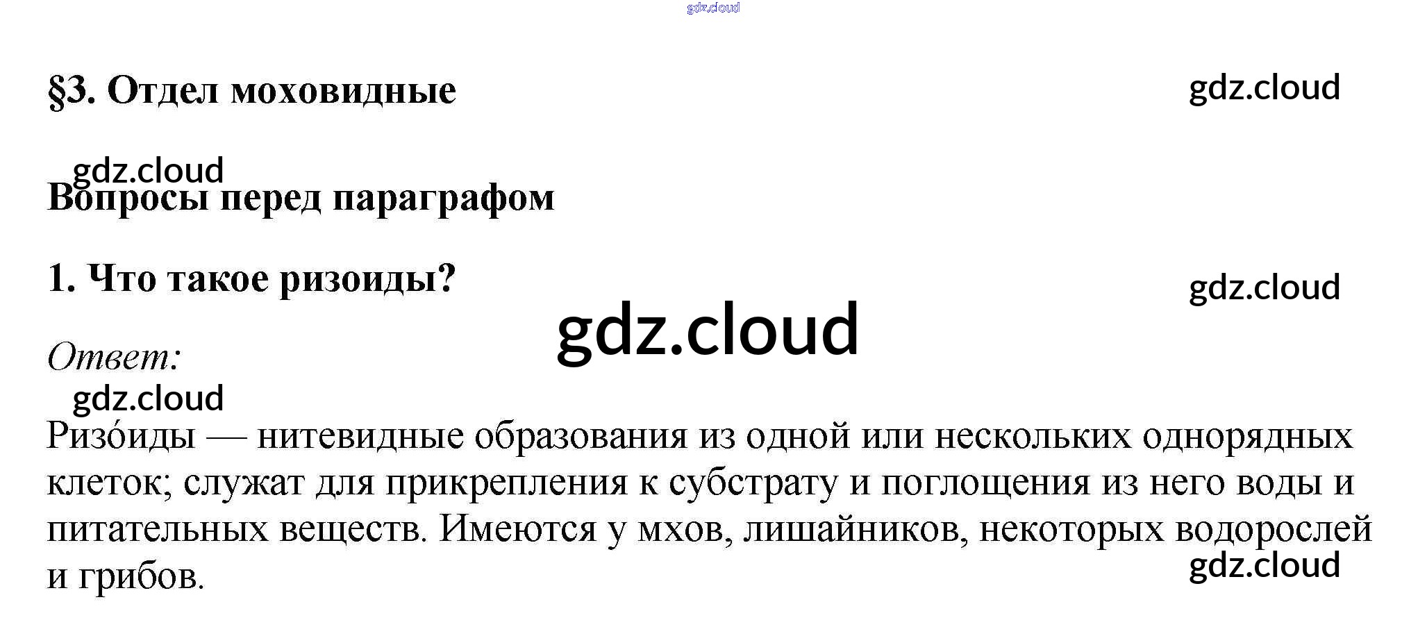 Вопросы перед параграфом Ответы к §3. Отдел моховидные по Биологии 7 класс Учебник Пасечник Линейный курс Дрофа
