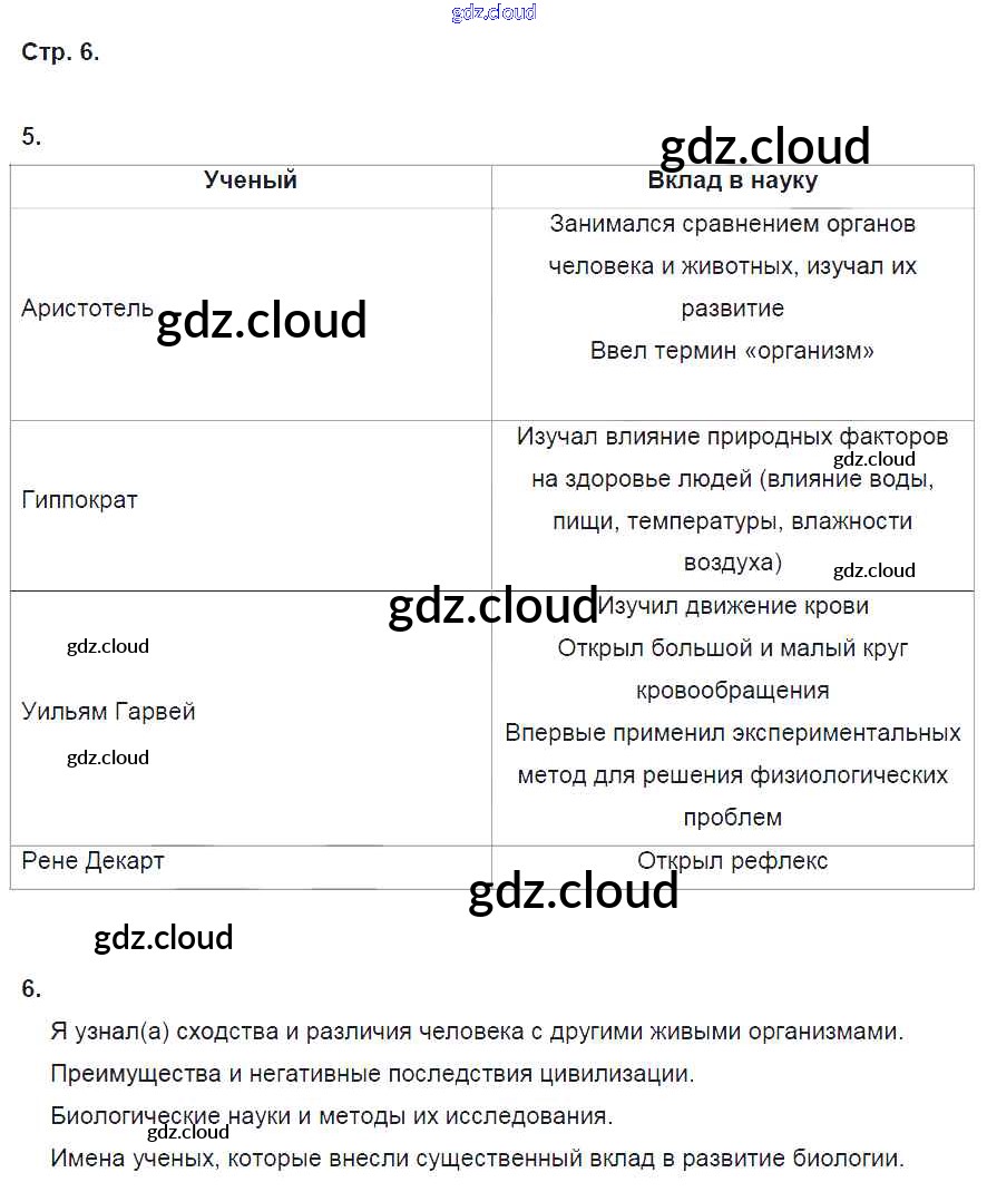 Ответ на задание 6 Рабочая тетрадь Биология за 8 (восьмой) класс Колесов, Маш, Беляев УМК 2018 ФГОС онлайн и без номера телефона.