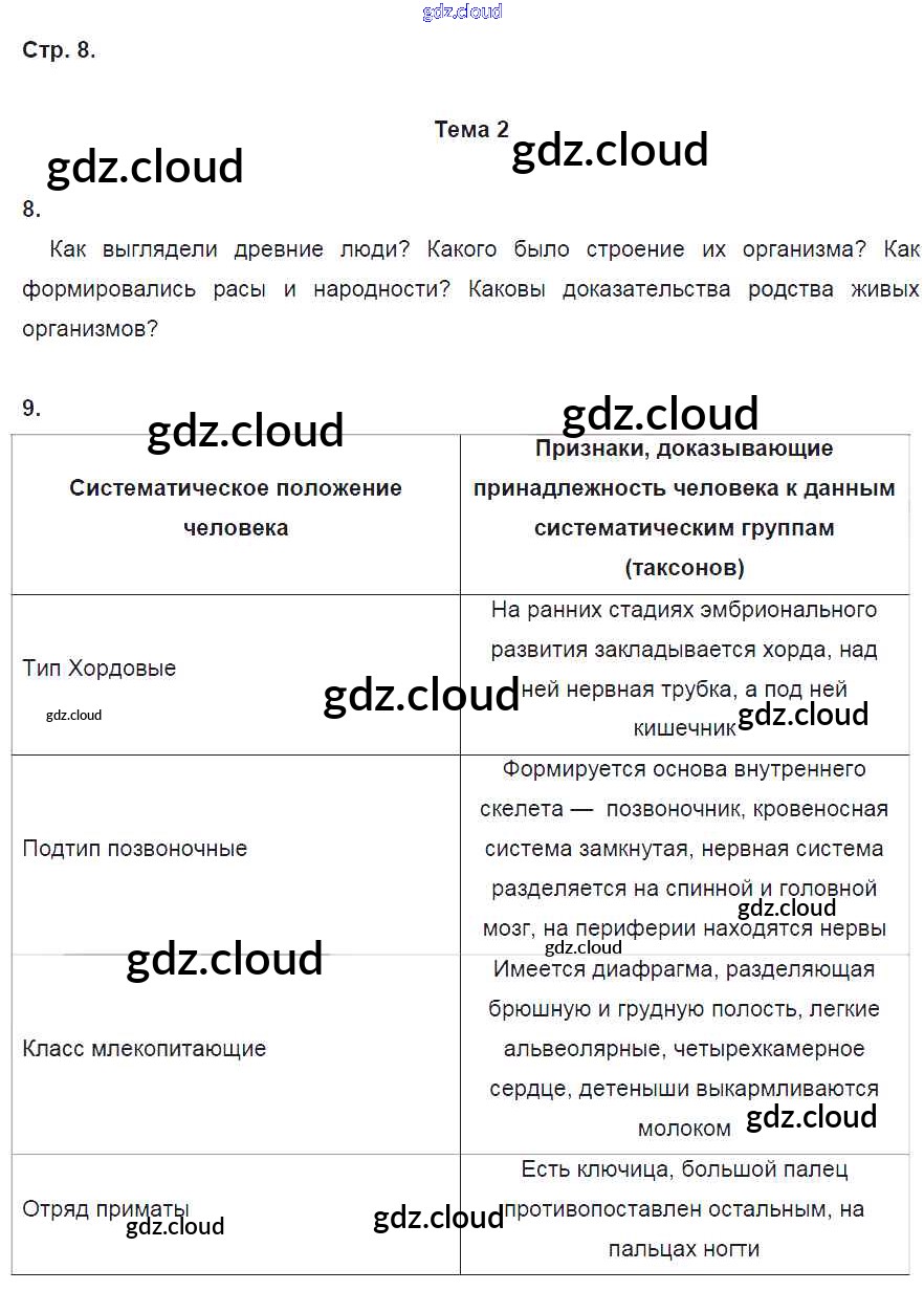 Ответ на задание 8 Рабочая тетрадь Биология за 8 (восьмой) класс Колесов, Маш, Беляев УМК 2018 ФГОС онлайн и без номера телефона.