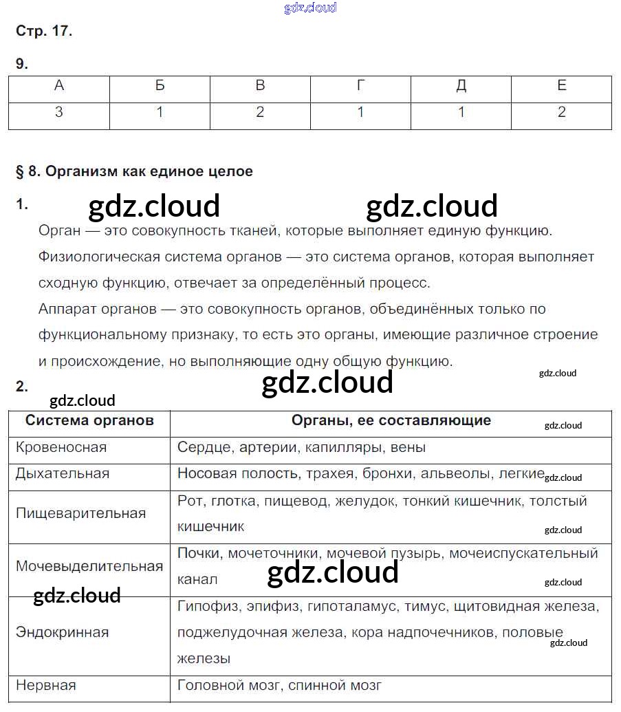 Ответ на задание 17 Рабочая тетрадь Биология за 8 (восьмой) класс Жемчугова, Романова Инновационная школа 2017 ФГОС онлайн и без номера телефона.