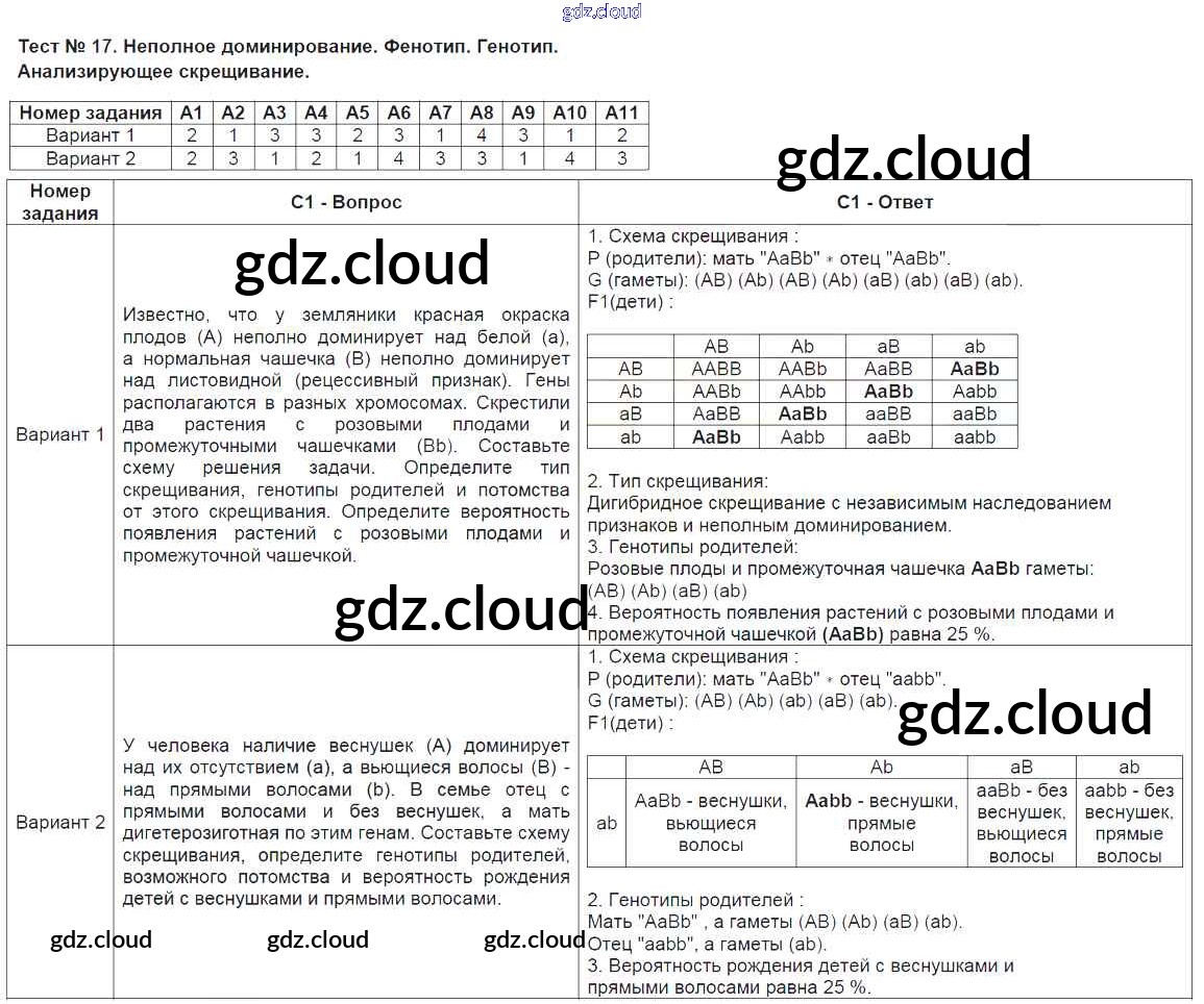 Ответ на задание Тест №17. Неполное доминирование. Фенотип. Генотип. Анализирующее скрещивание Контрольно-измерительные материалы (КИМ) Биология за 9 (девятый) класс Богданов 2017