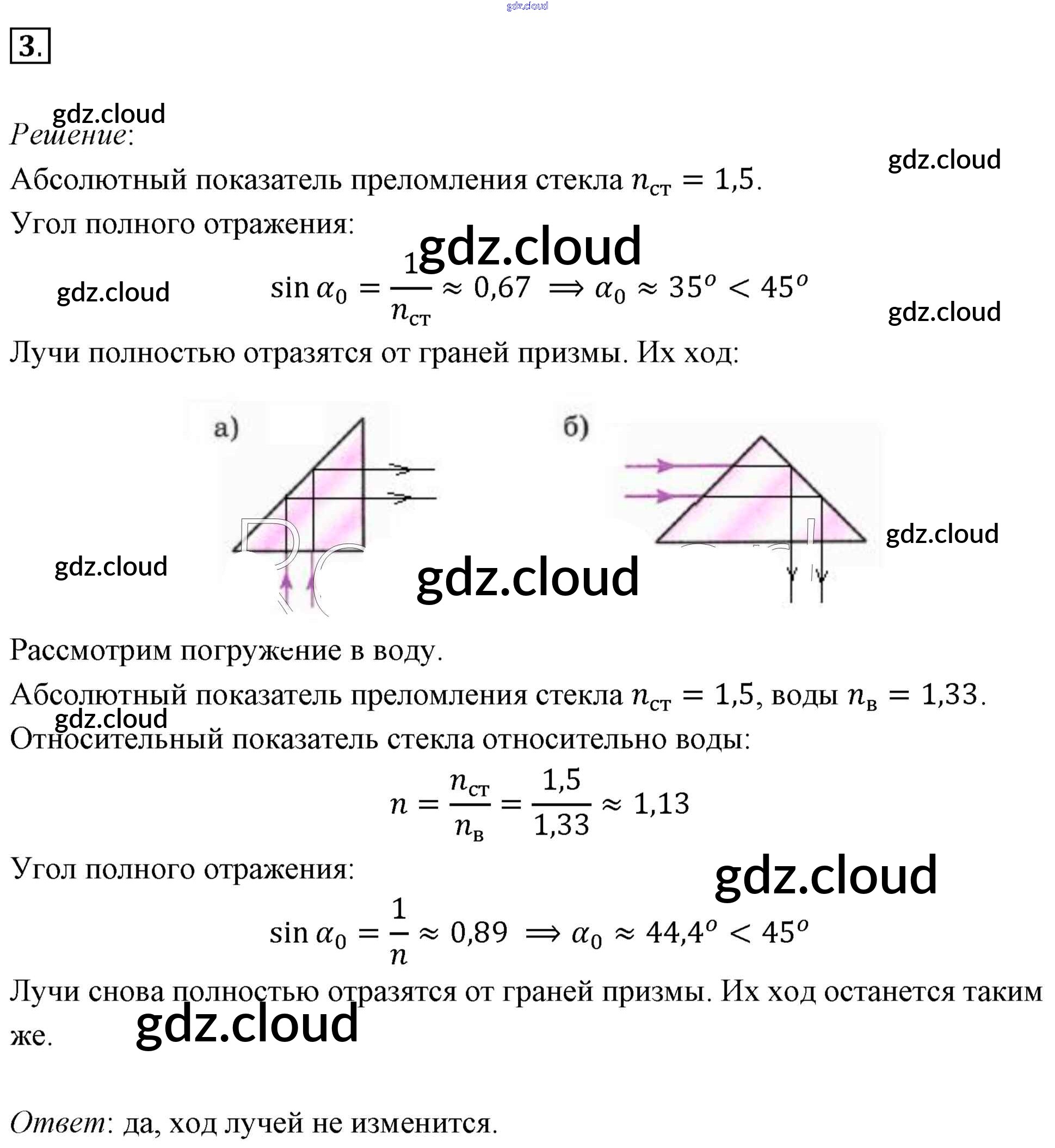 Задачи для самостоятельного решения Ответы к §49. Примеры решения задач по теме «Закон преломления света. Полное отражение света» по Физике 11 класс Учебник Мякишев  Базовый уровень  Просвещение
