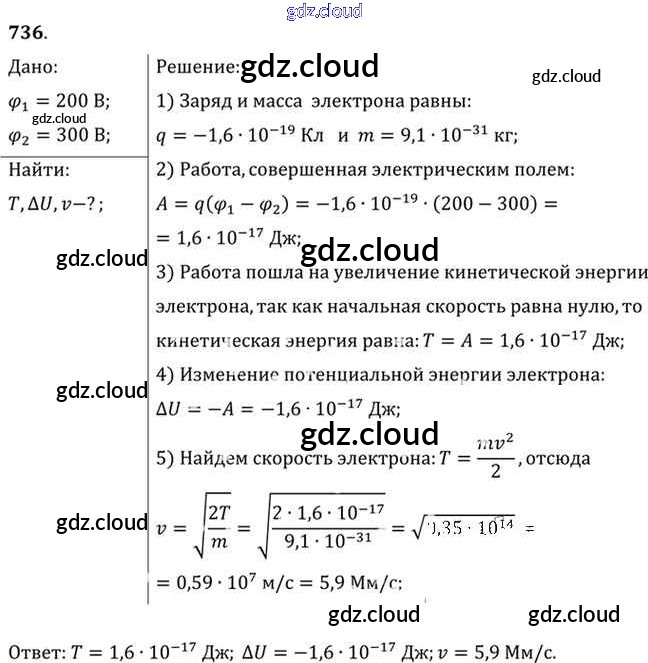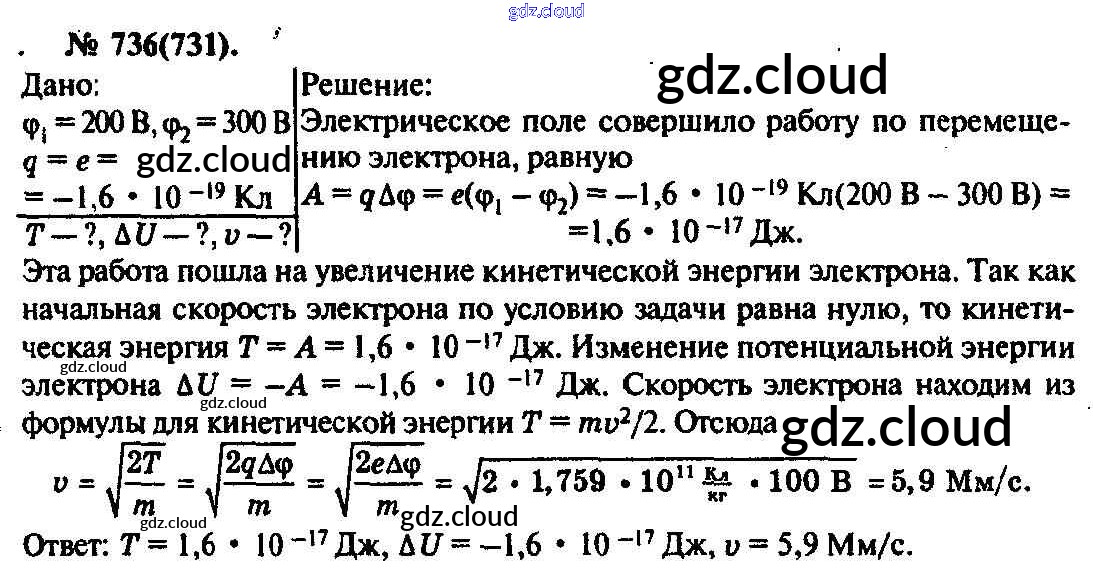 Ответ на задание 736 Задачник Физика за 10, 11 (десятый, одиннадцатый) класс Рымкевич УМК 2013