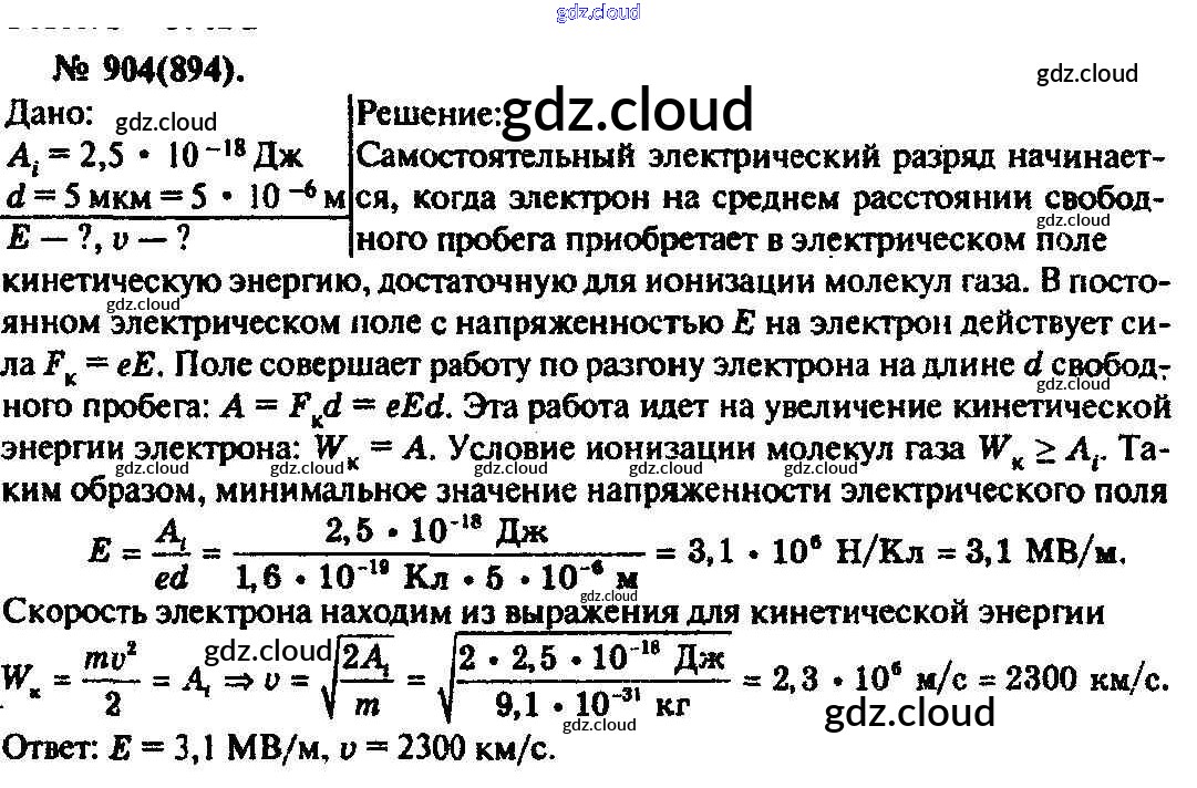 Ответ на задание 904 Задачник Физика за 10, 11 (десятый, одиннадцатый) класс Рымкевич УМК 2013