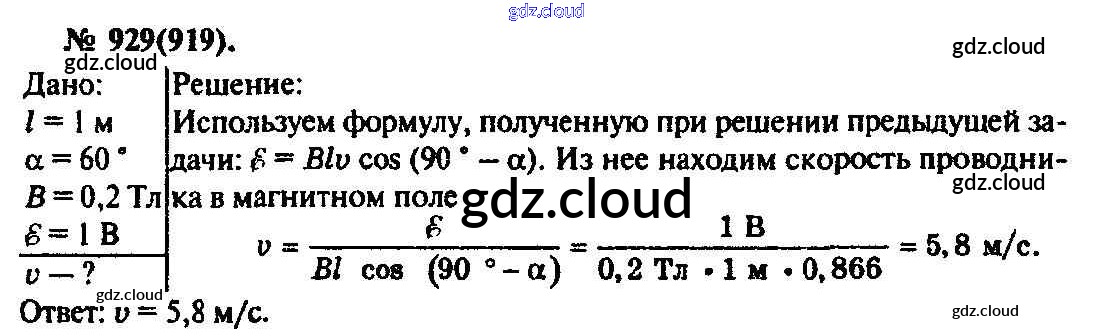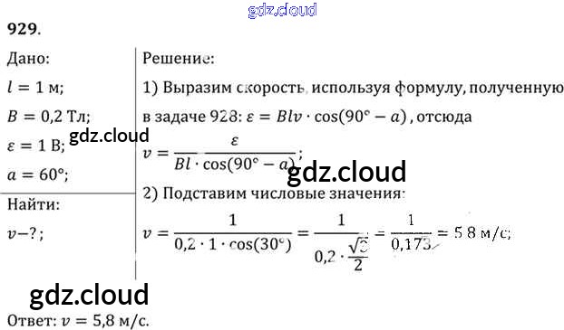 Ответ на задание 929 Задачник Физика за 10, 11 (десятый, одиннадцатый) класс Рымкевич УМК 2013