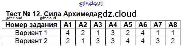 Ответ на задание Тест №12. Сила Архимеда Контрольно-измерительные материалы (КИМ) Физика за 7 (седьмой) класс Бобошина 2014
