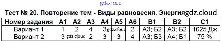 Ответ на задание Тест №20. Повторение тем - Виды равновесия. Энергия Контрольно-измерительные материалы (КИМ) Физика за 7 (седьмой) класс Бобошина 2014