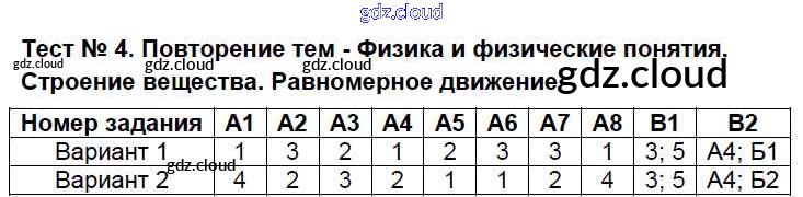 Ответ на задание Тест №4. Повторение тем - Физика и физические понятия и др. Контрольно-измерительные материалы (КИМ) Физика за 7 (седьмой) класс Бобошина 2014