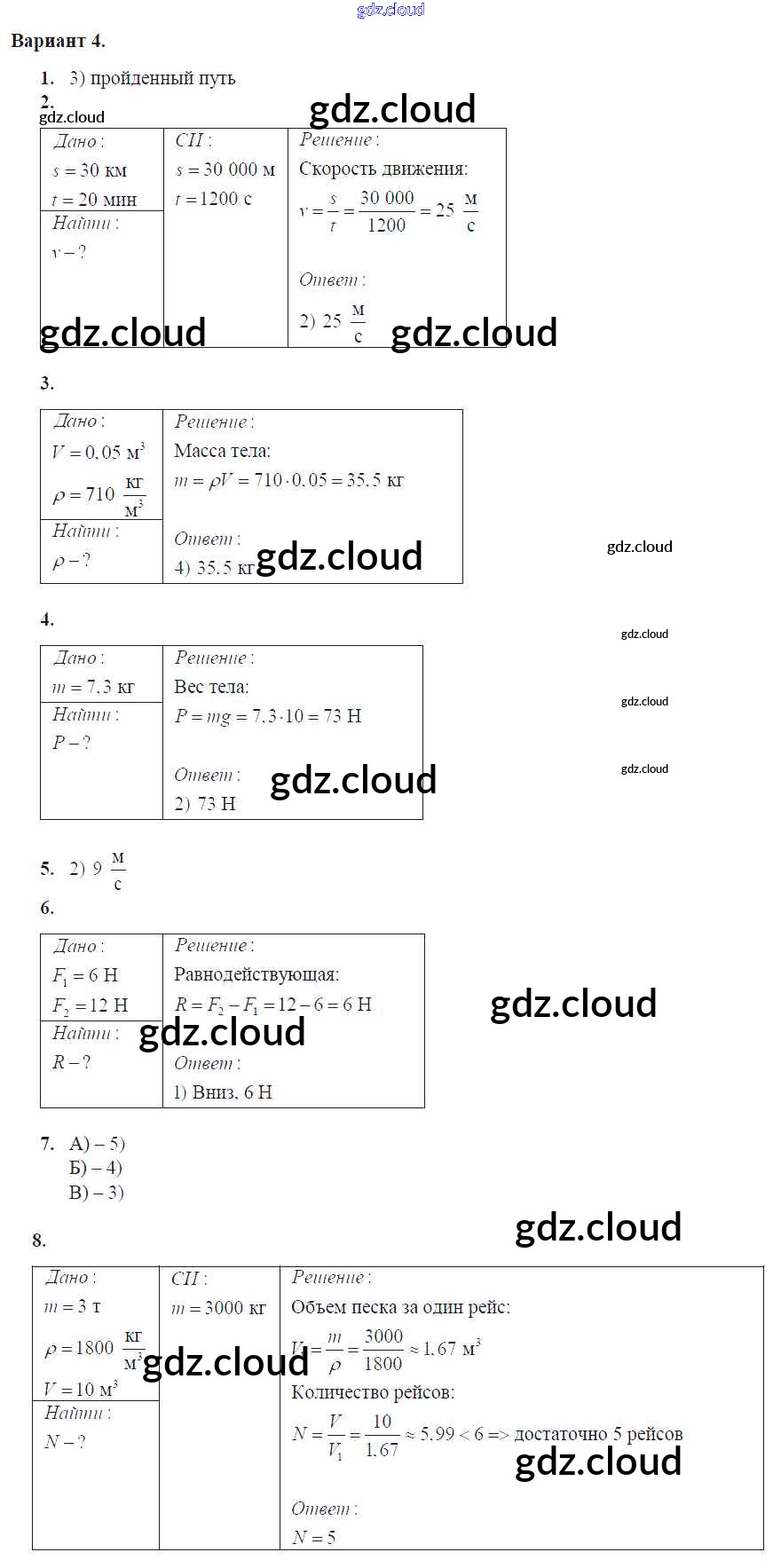 Ответ на задание Вар. 4 Контрольные и самостоятельные работы Физика за 7 (седьмой) класс Громцева УМК 2020