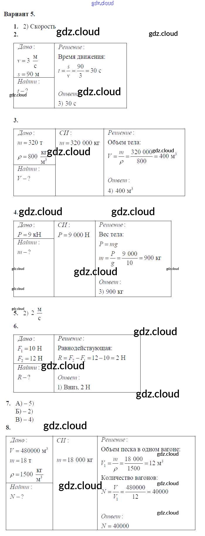 Ответ на задание Вар. 5 Контрольные и самостоятельные работы Физика за 7 (седьмой) класс Громцева УМК 2020