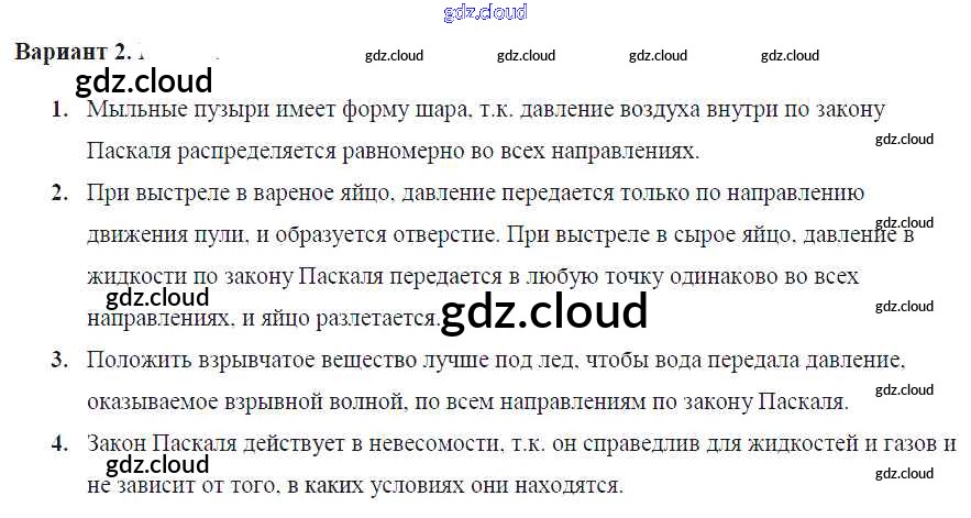 СР №27. Передача давления жидкостями и газами. Закон Паскаля Ответы к самостоятельным работам по Физике 7 класс Контрольные и самостоятельные работы Громцева УМК Экзамен
