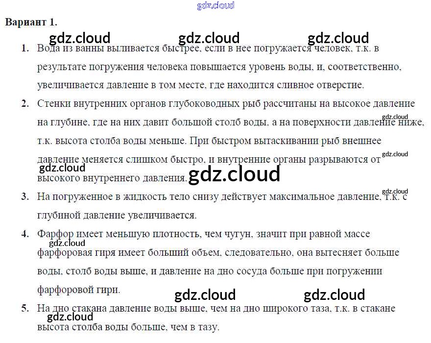 СР №28. Давление в жидкости и газе Ответы к самостоятельным работам по Физике 7 класс Контрольные и самостоятельные работы Громцева УМК Экзамен