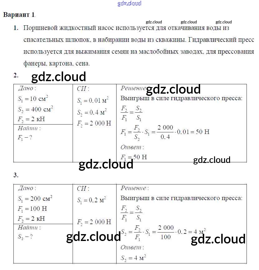 СР №34. Поршневой жидкостный насос. Гидравлический пресс Ответы к самостоятельным работам по Физике 7 класс Контрольные и самостоятельные работы Громцева УМК Экзамен