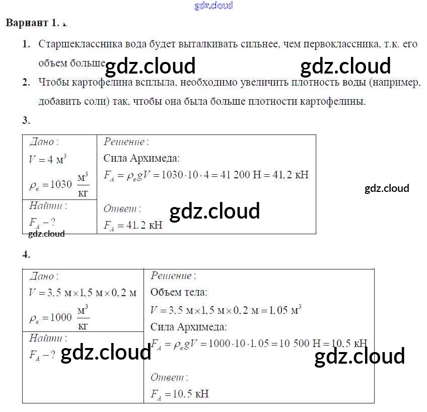 самостоятельная работа / ср №37. Архимедова сила / вар. 1
