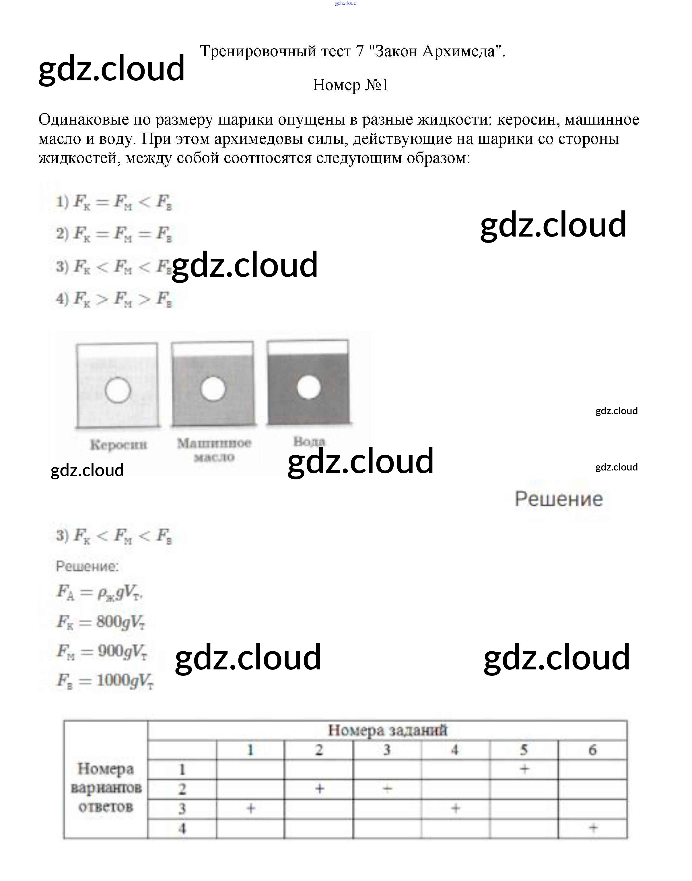 Тренировочный тест 7 "Закон Архимеда" Ответы к тестам по Физике 7 класс Рабочая тетрадь Ханнанова Вертикаль Дрофа