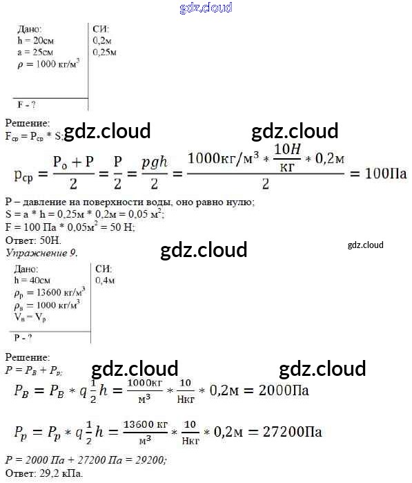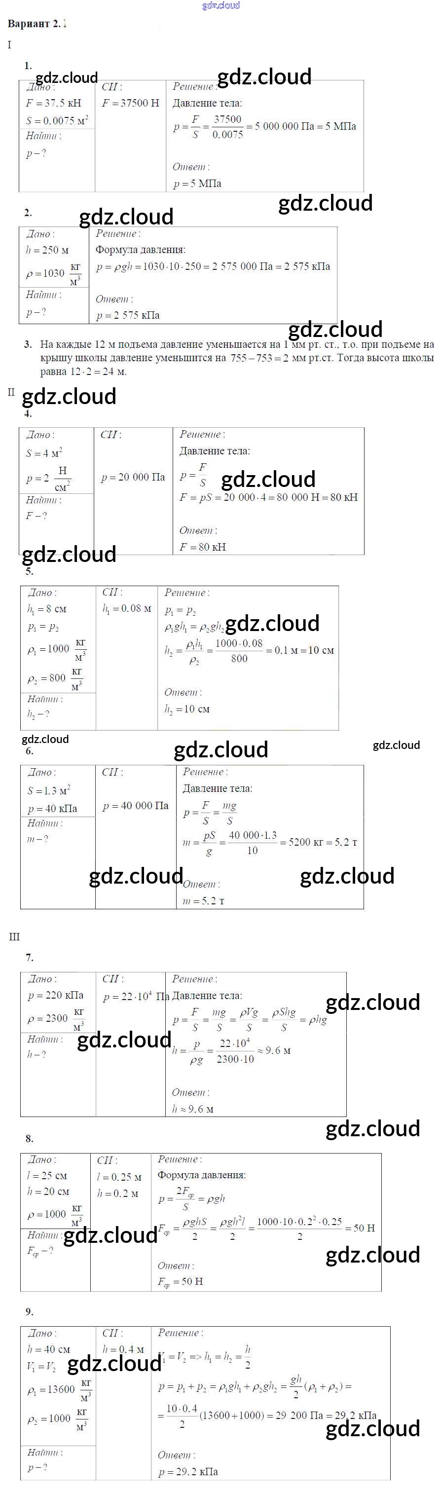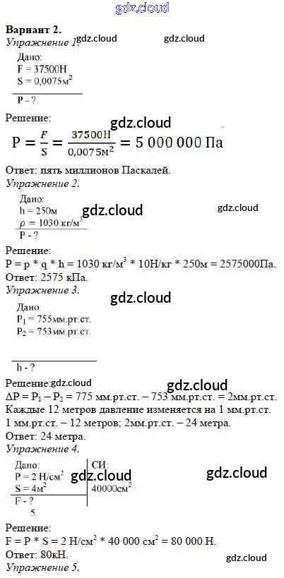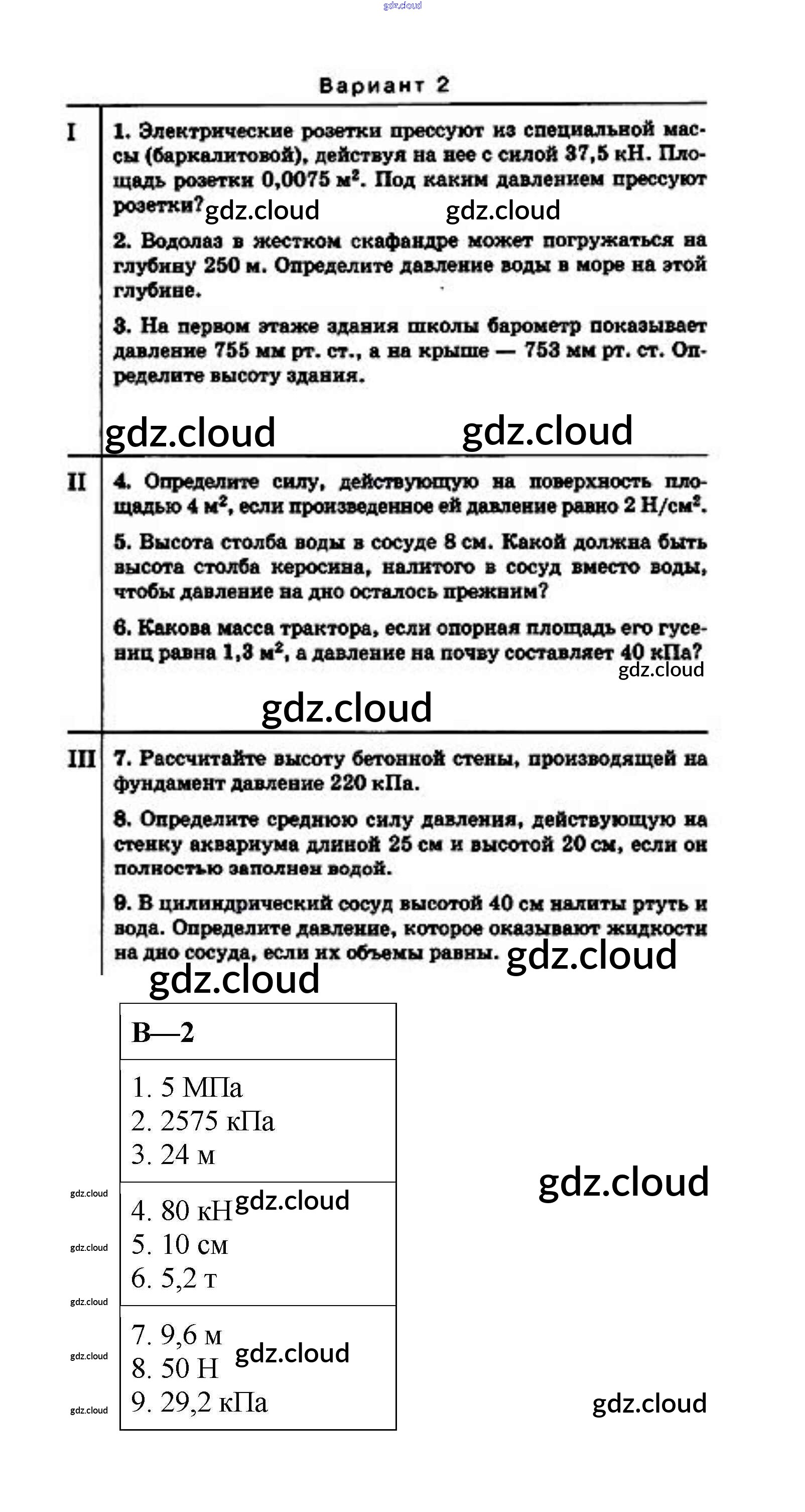 КР №-2. Давление твердых тел, жидкостей и газов Ответы к контрольным работам по Физике 7 класс Дидактические материалы Марон Вертикаль Дрофа