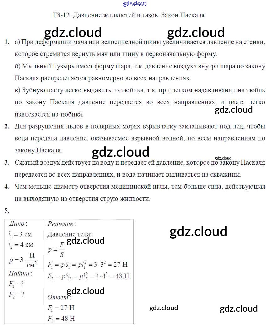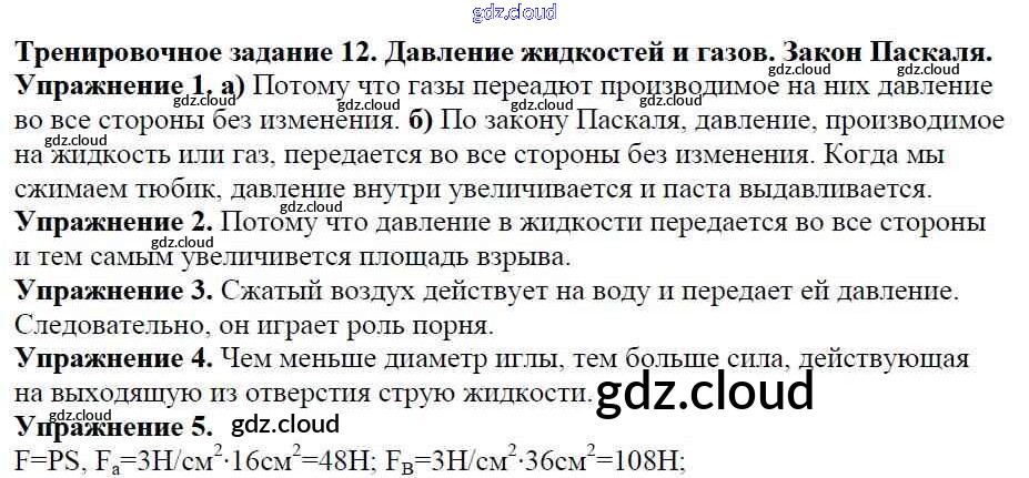 Ответ на задание Задание №12. Давление жидкостей и газов. Закон Паскаля Дидактические материалы Физика за 7 (седьмой) класс Марон Вертикаль 2019