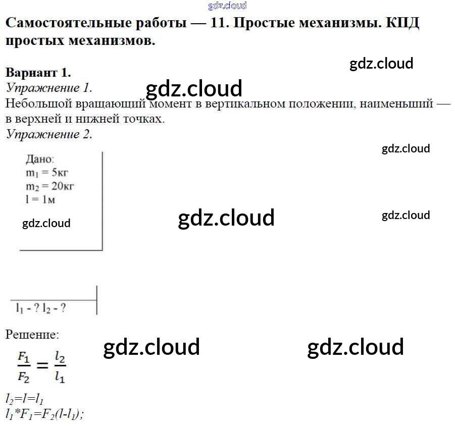СР №-11. Простые механизмы. КПД простых механизмов Ответы к самостоятельным работам по Физике 7 класс Дидактические материалы Марон Вертикаль Дрофа