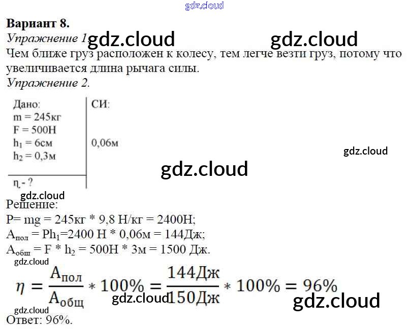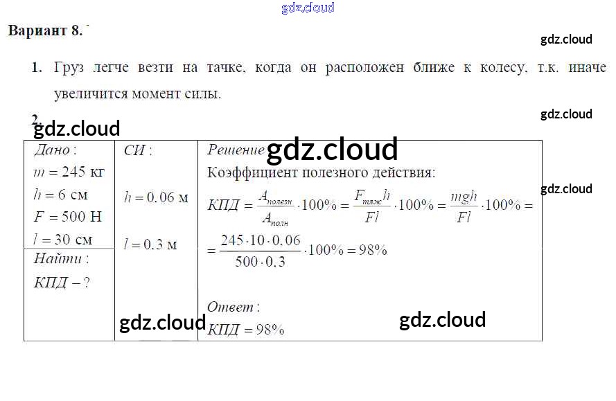 Ответ на задание Вариант №8 Дидактические материалы Физика за 7 (седьмой) класс Марон Вертикаль 2019
