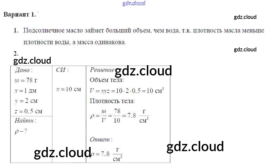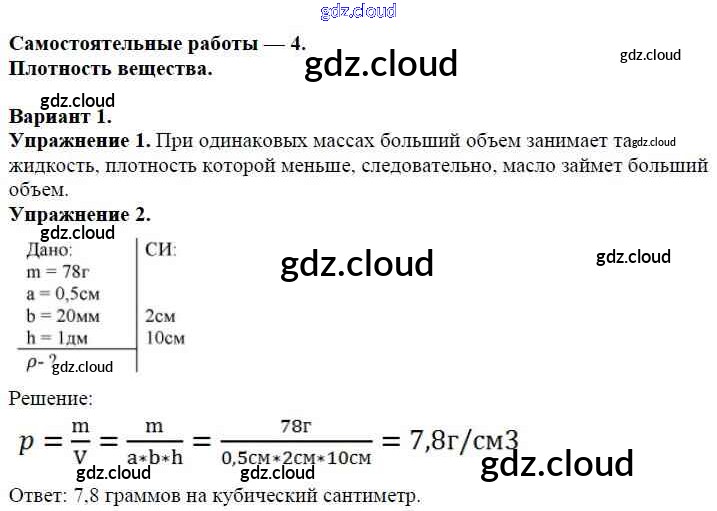 СР №-4. Плотность вещества Ответы к самостоятельным работам по Физике 7 класс Дидактические материалы Марон Вертикаль Дрофа