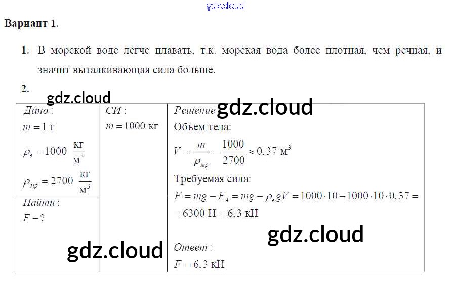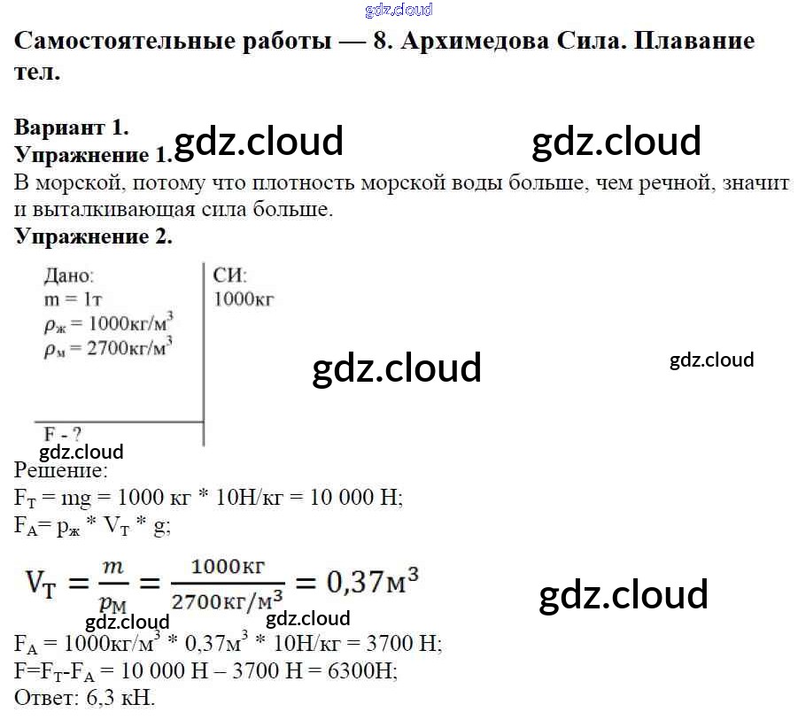 СР №-8. Архимедова сила. Плавание тел Ответы к самостоятельным работам по Физике 7 класс Дидактические материалы Марон Вертикаль Дрофа
