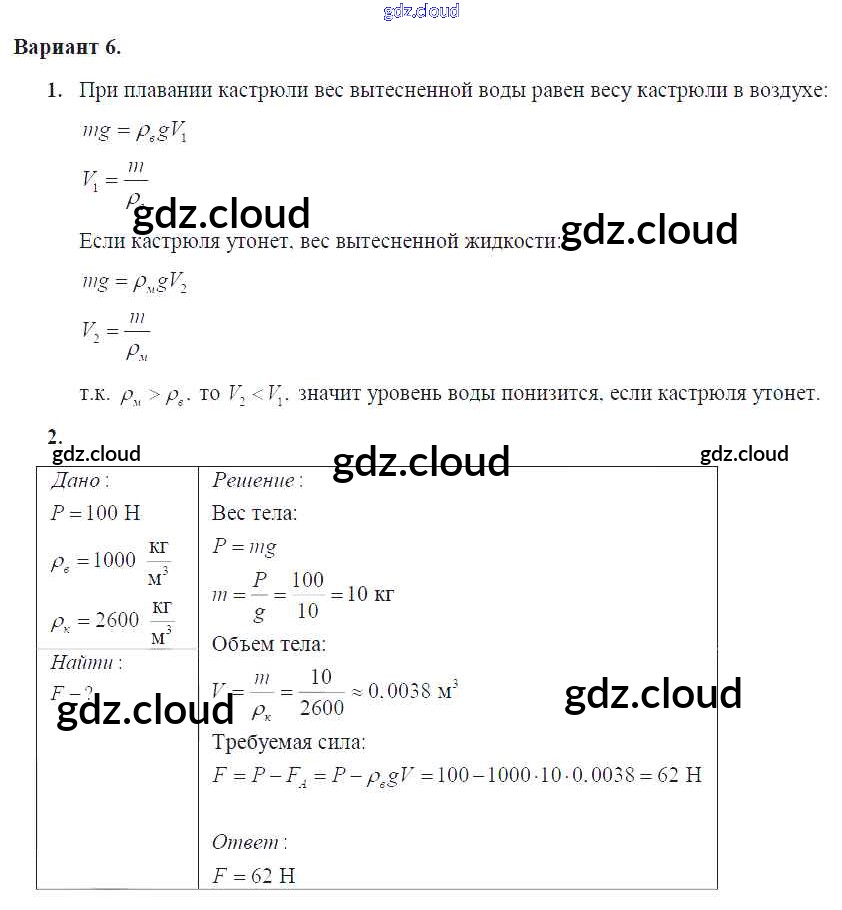 СР №-8. Архимедова сила. Плавание тел Ответы к самостоятельным работам по Физике 7 класс Дидактические материалы Марон Вертикаль Дрофа