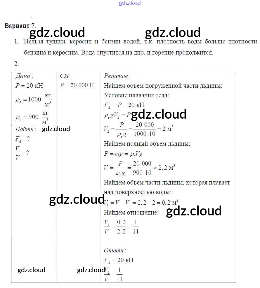 Ответ на задание Вариант №7 Дидактические материалы Физика за 7 (седьмой) класс Марон Вертикаль 2019