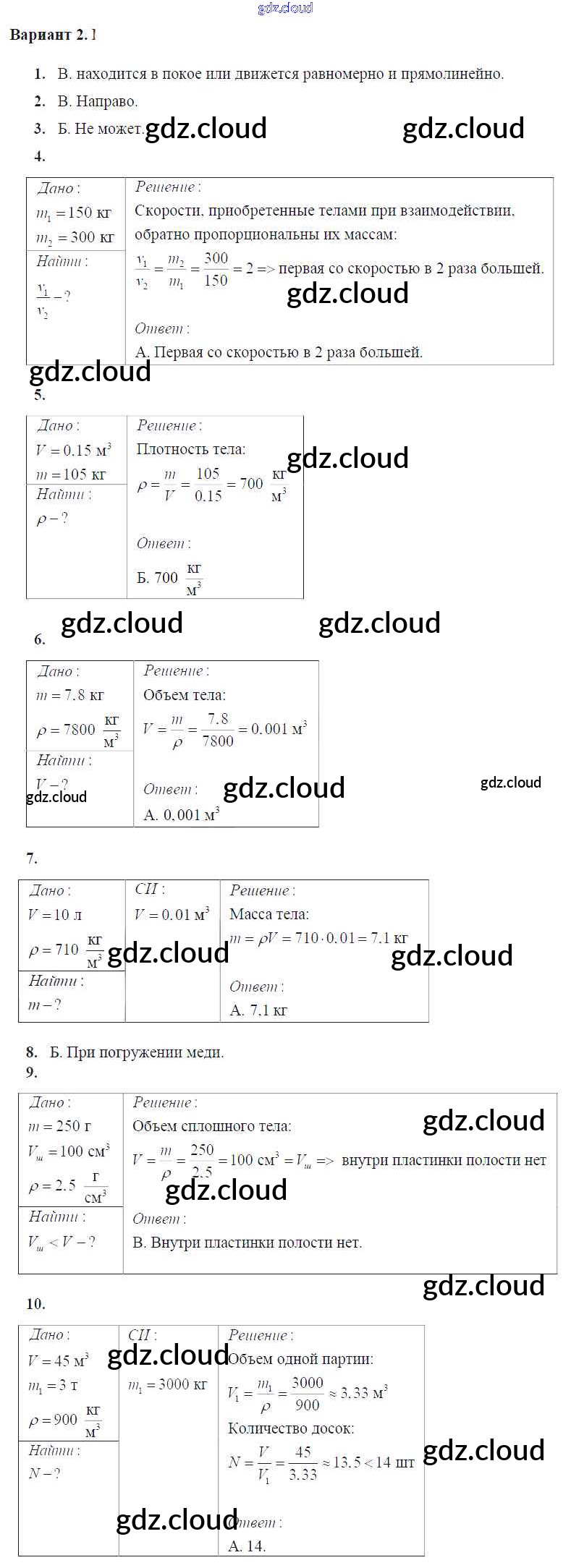 Тест №3. Инерция. Взаимодействие тел. Масса тела. Плотность вещества Ответы к тесты для самоконтроля по Физике 7 класс Дидактические материалы Марон Вертикаль Дрофа