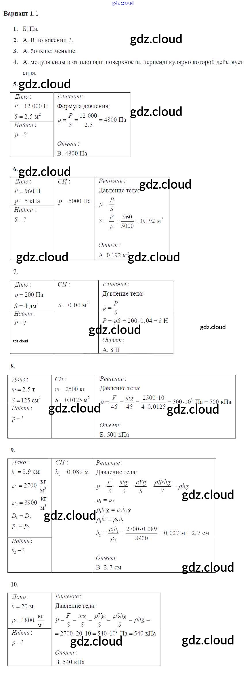Тест №5. Давление твердых тел Ответы к тесты для самоконтроля по Физике 7 класс Дидактические материалы Марон Вертикаль Дрофа