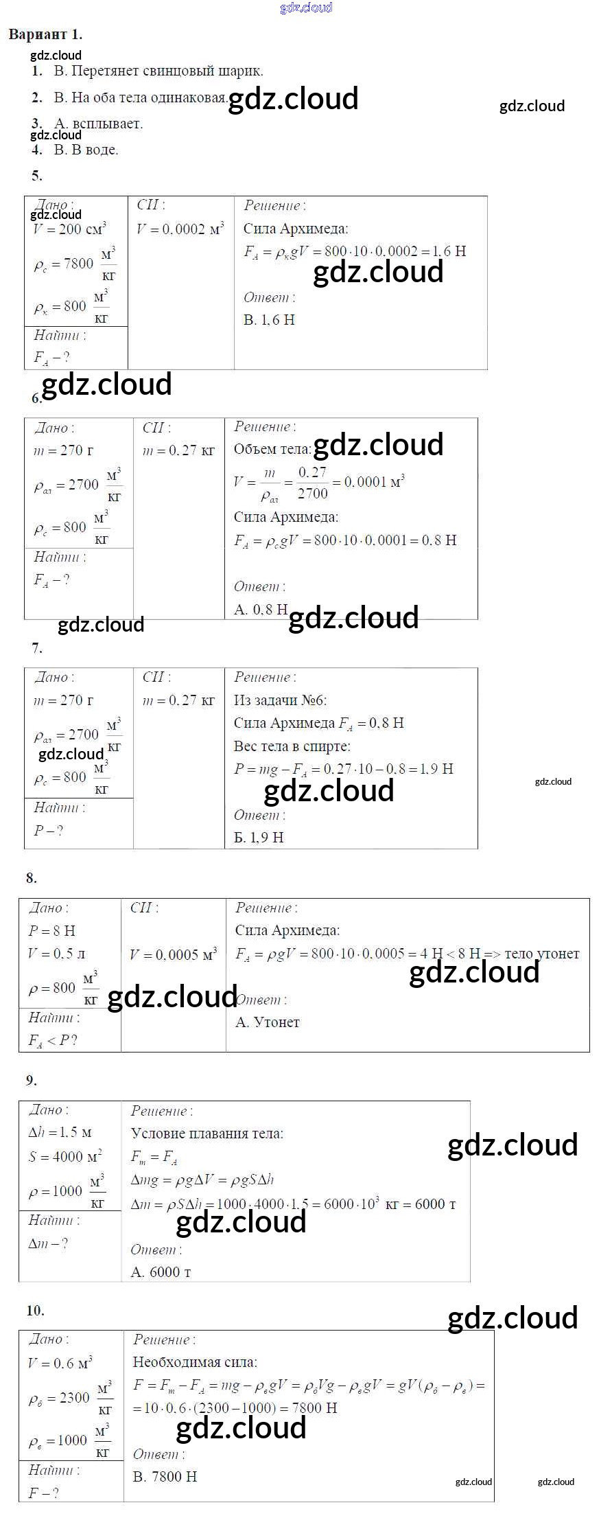 Тест №7. Архимедова сила. Плавание тел Ответы к тесты для самоконтроля по Физике 7 класс Дидактические материалы Марон Вертикаль Дрофа