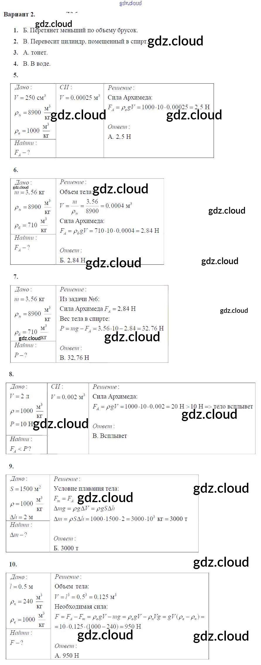 Тест №7. Архимедова сила. Плавание тел Ответы к тесты для самоконтроля по Физике 7 класс Дидактические материалы Марон Вертикаль Дрофа