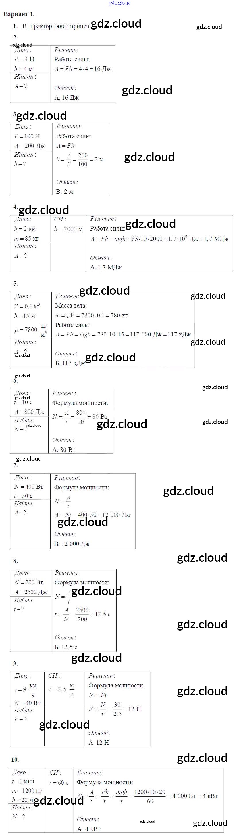 Тест №8. Механическая работа и мощность Ответы к тесты для самоконтроля по Физике 7 класс Дидактические материалы Марон Вертикаль Дрофа