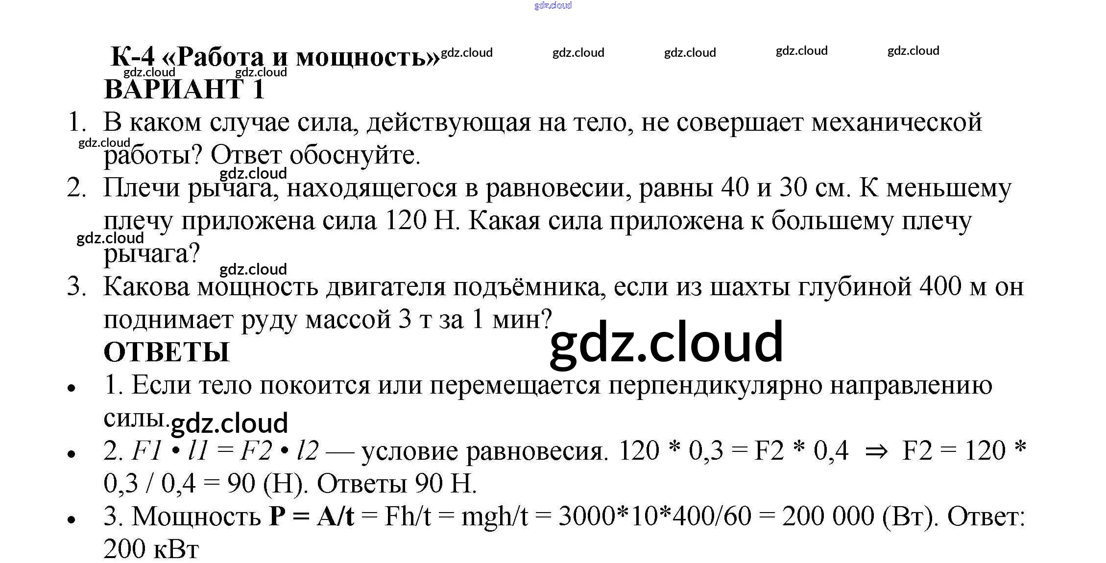 КР №-4. Работа и мощность. Энергия Ответы к контрольным работам по Физике 7 класс Самостоятельные и контрольные работы Марон Вертикаль Дрофа