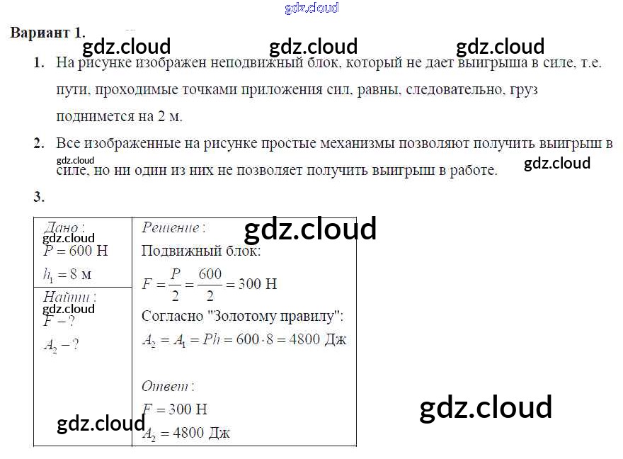 СР-№62. Равенство работ при использовании простых механизмов Ответы к самостоятельным работам по Физике 7 класс Самостоятельные и контрольные работы Марон Вертикаль Дрофа