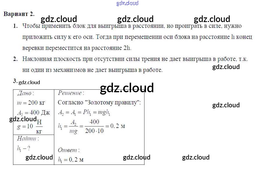 СР-№62. Равенство работ при использовании простых механизмов Ответы к самостоятельным работам по Физике 7 класс Самостоятельные и контрольные работы Марон Вертикаль Дрофа