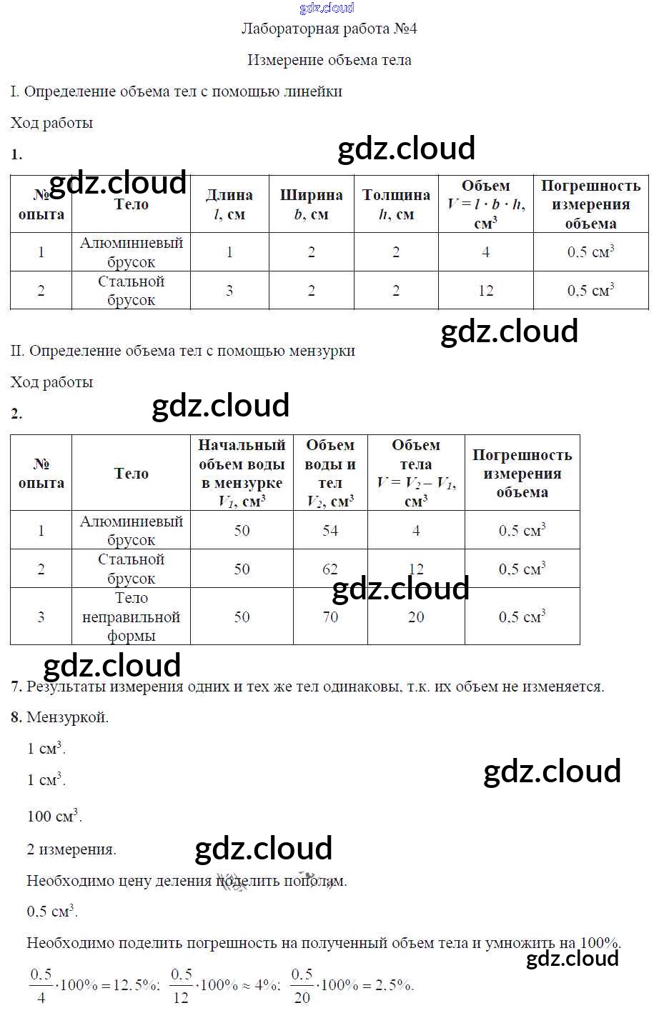 Ответ на задание ЛР №4. Измерение объема тела Тетрадь для лабораторных работ Физика за 7 (седьмой) класс Минькова, Иванова УМК 2017