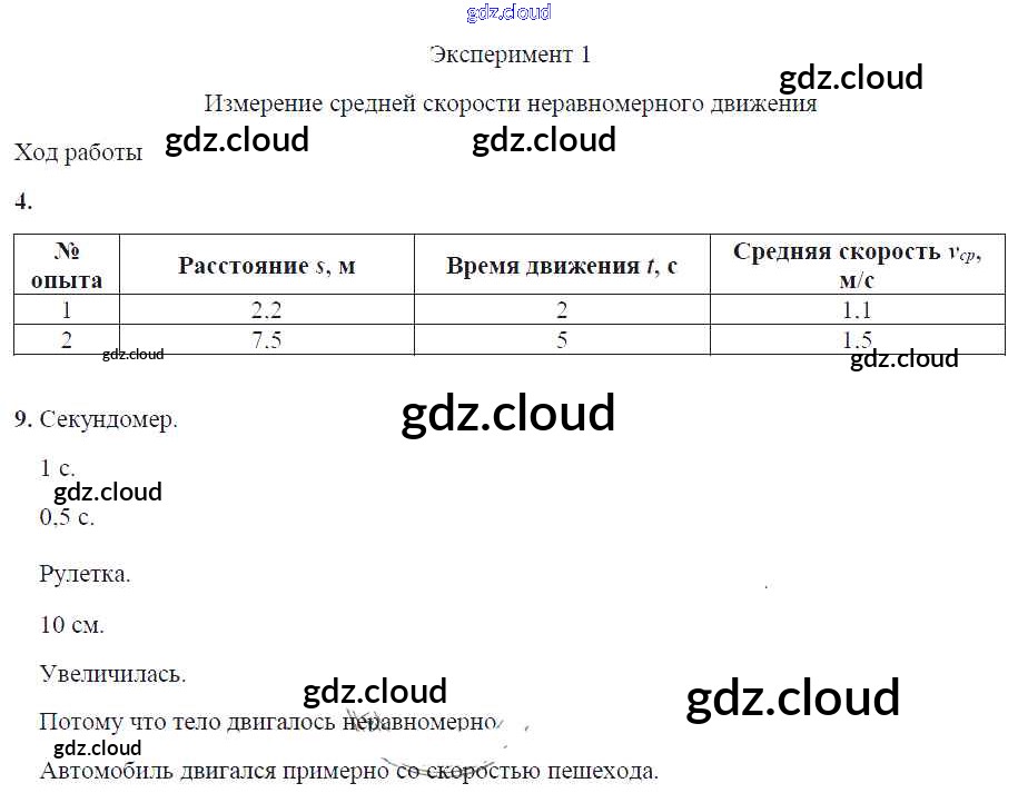 Ответ на задание Эксперимент 1. Измерение средней скорости неравномерного движения Тетрадь для лабораторных работ Физика за 7 (седьмой) класс Минькова, Иванова УМК 2017