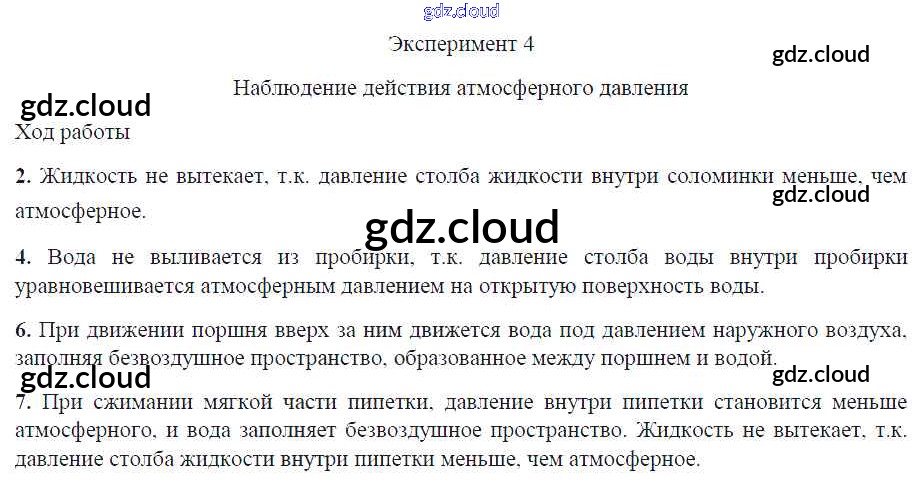 Ответ на задание Эксперимент 4. Наблюдение действия атмосферного давления Тетрадь для лабораторных работ Физика за 7 (седьмой) класс Минькова, Иванова УМК 2017