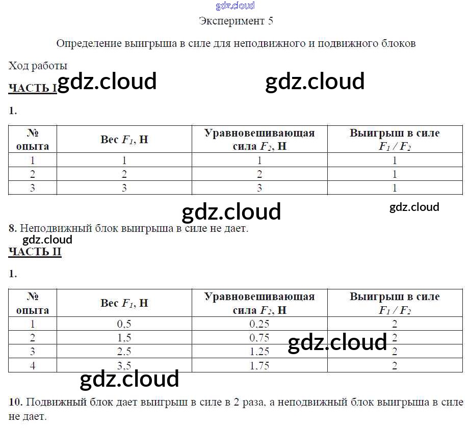 Ответ на задание Эксперимент 5. Определение выигрыша в силе для подвижного и неподвижного блоков Тетрадь для лабораторных работ Физика за 7 (седьмой) класс Минькова, Иванова УМК 2017