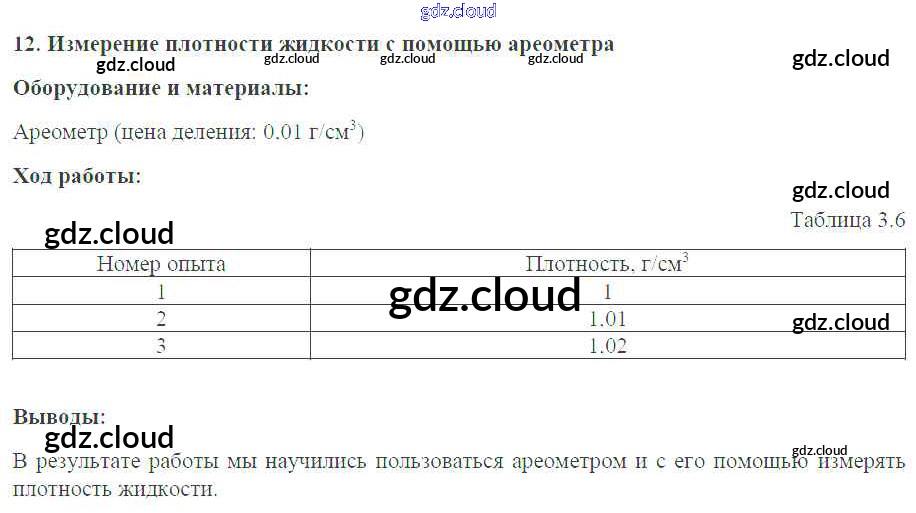 Ответ на задание №12. Измерение плотности жидкости с помощью ареометра Тетрадь-практикум Физика за 7 (седьмой) класс Белага, Воронцова, Жумаев, Ломаченков, Панебратцев Сферы 2012