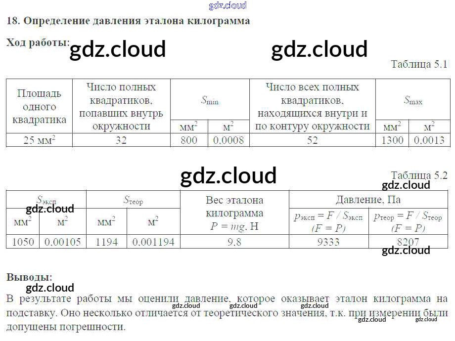 Ответ на задание №18. Определение давления эталона килограмма Тетрадь-практикум Физика за 7 (седьмой) класс Белага, Воронцова, Жумаев, Ломаченков, Панебратцев Сферы 2012