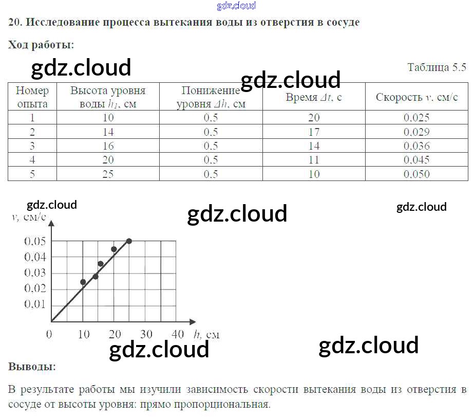 Ответ на задание №20. Исследование процесса вытекания воды из отверстия в сосуде Тетрадь-практикум Физика за 7 (седьмой) класс Белага, Воронцова, Жумаев, Ломаченков, Панебратцев Сферы 2012