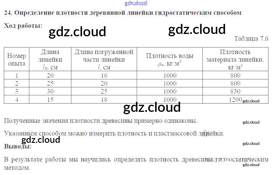 Ответ на задание №24. Определение плотности деревянной линейки гидростатическим способом Тетрадь-практикум Физика за 7 (седьмой) класс Белага, Воронцова, Жумаев, Ломаченков, Панебратцев Сферы 2012