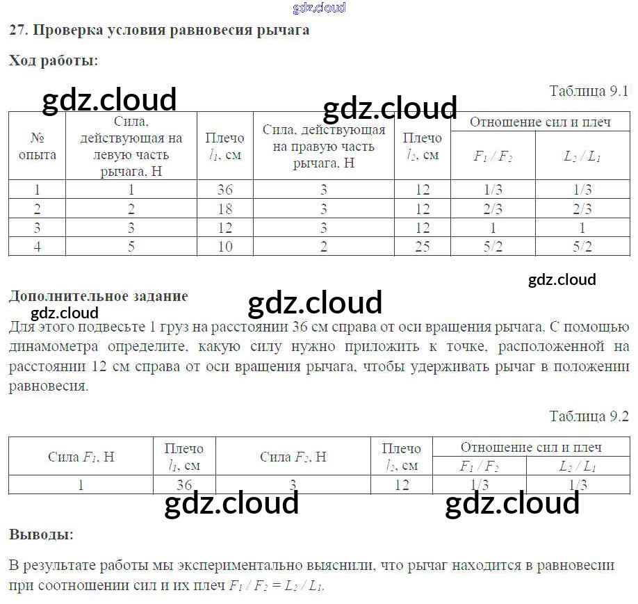 Ответ на задание №27. Проверка условия равновесия рычага Тетрадь-практикум Физика за 7 (седьмой) класс Белага, Воронцова, Жумаев, Ломаченков, Панебратцев Сферы 2012